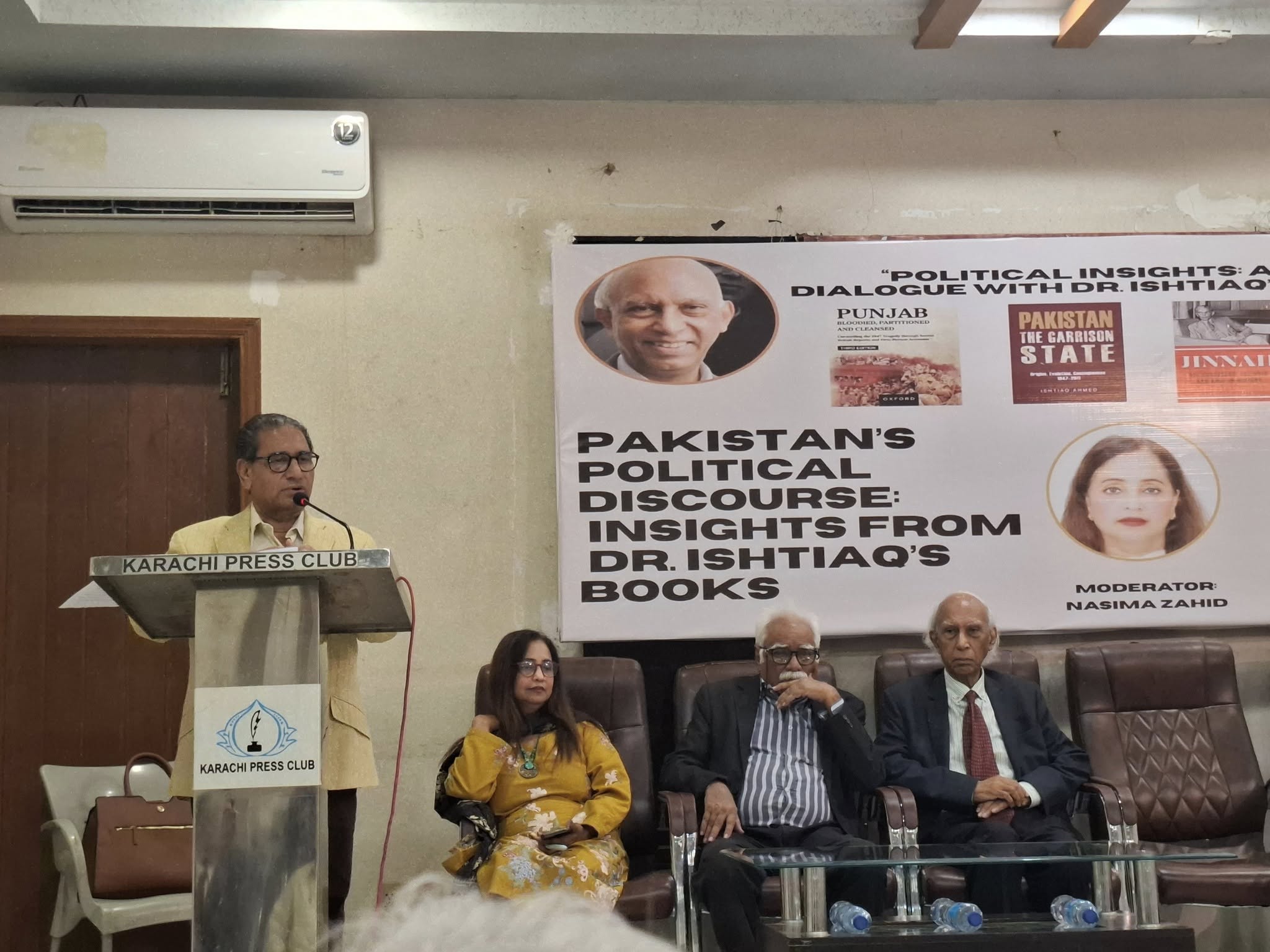 The Karachi Union of Journalists has initiated a series of discussions with researchers and academics on various aspects of history, developments, and politics in the context of the current political situation of the country. The first program in this series was inaugurated with a dialogue featuring Dr. Ishtiaq Ahmed .A conversation was held with him regarding his books. On this occasion, Karachi Union of Journalists President Tahir Hassan expressed his initial remarks and highlighted the importance of the topic. Renowned researcher Dr. Ishtiaq, Dr. Tauseef Ahmed Khan, and the event moderator Nasima Zahid were seated on stage.