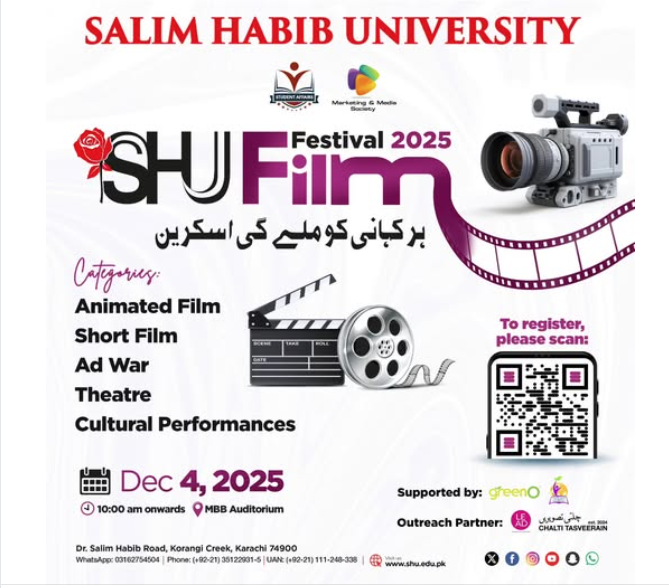 Salim Habib University’s Student Affairs Department is thrilled to unveil an upcoming event, the SHU Film Festival 2025, organized by our Marketing & Media Society. The event will offer an incredible opportunity for film buffs to showcase their passion and talent for filmmaking in multiple categories – from creative animated films to dynamic short films, and an intense Ad War!
