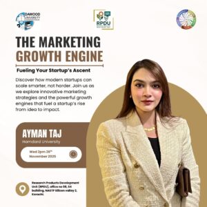 The session conducted by Ms. Ayman Taj, brought together RPDU startups, young innovators, and aspiring entrepreneurs, all eager to learn how to build a strong marketing pipeline, create growth-focused strategies, and scale their ventures effectively in todayโs dynamic business landscape. Trainer shared practical frameworks, real-world examples, and actionable strategies that resonated strongly with early-stage founders and students alike. Her energetic delivery and deep insights into industry made the session highly interactive and impactful.