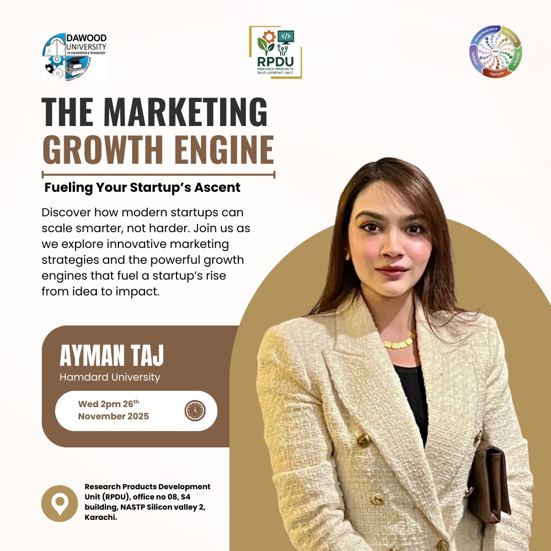 Marketing strategy is an important skill for any startup as it helps in attracting customers and builds strong brand identity. In order to groom the startups working at Research Products Development Unit (RPDU), the Office of Research, Innovation & Commercialization – DUET, organized a training session titled โThe Marketing Growth Engine: Fueling Your Startupโs Ascentโ, on 26th November 2025.