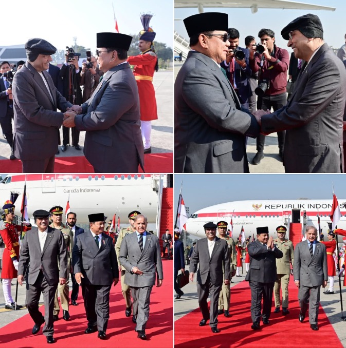 President Asif Ali Zardari, accompanied by Prime Minister Muhammad Shehbaz Sharif, receives President Prabowo Subianto of the Republic of Indonesia upon his arrival at Nur Khan Airbase