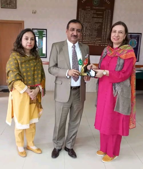 Director Centre of Excellence in Analytical Chemistry Prof Dr Amber Solangi is seen receiving the shield from the Vice-Chancellor Professor Dr Fateh Muhammad Marri, which she earned on the eve of 5th Pak-Turk International Conference on Chemical Science held at the University of Karachi on December 4-5, 2025. Professor Dr Najma Memon is also in the frame.