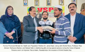 so they may regain dignified employment. He added that persons with disabilities do not need sympathy—they deserve opportunities. Director Social Welfare Rana Shahid announced that the government is introducing a major initiative for persons with disabilities, especially the visually impaired, under which 5,000 blind individuals will receive a monthly scholarship of Rs. 12,000. He added that several other projects aimed at rehabilitation and empowerment of persons with disabilities are in their final stages, with the objective of making them self-reliant. President Anjuman Faiz-ul-Islam Dr. Riaz Ahmed stated that nations progress only when they consider their disabled citizens an asset rather than a burden, and work alongside the government for their development. He said that by adhering to Islamic principles and accepting collective responsibility, poverty and deprivation can be eradicated. Chairman Voice of Special Persons Nabeel Satti said that the state is like a mother, and a mother must care for all her children equally. Persons with disabilities are our responsibility, and stronger, well-coordinated policies and practical measures are needed for their welfare. He appreciated the government’s recent efforts but stressed the need to accelerate implementation at the grassroots level. At the end of the ceremony, gifts and aid packages were distributed among various persons with disabilities. Participants emphasized that the International Day of Persons with Disabilities should not be limited to a single day; rather, efforts for their rights, employment, and equal opportunities must continue throughout the year.