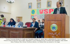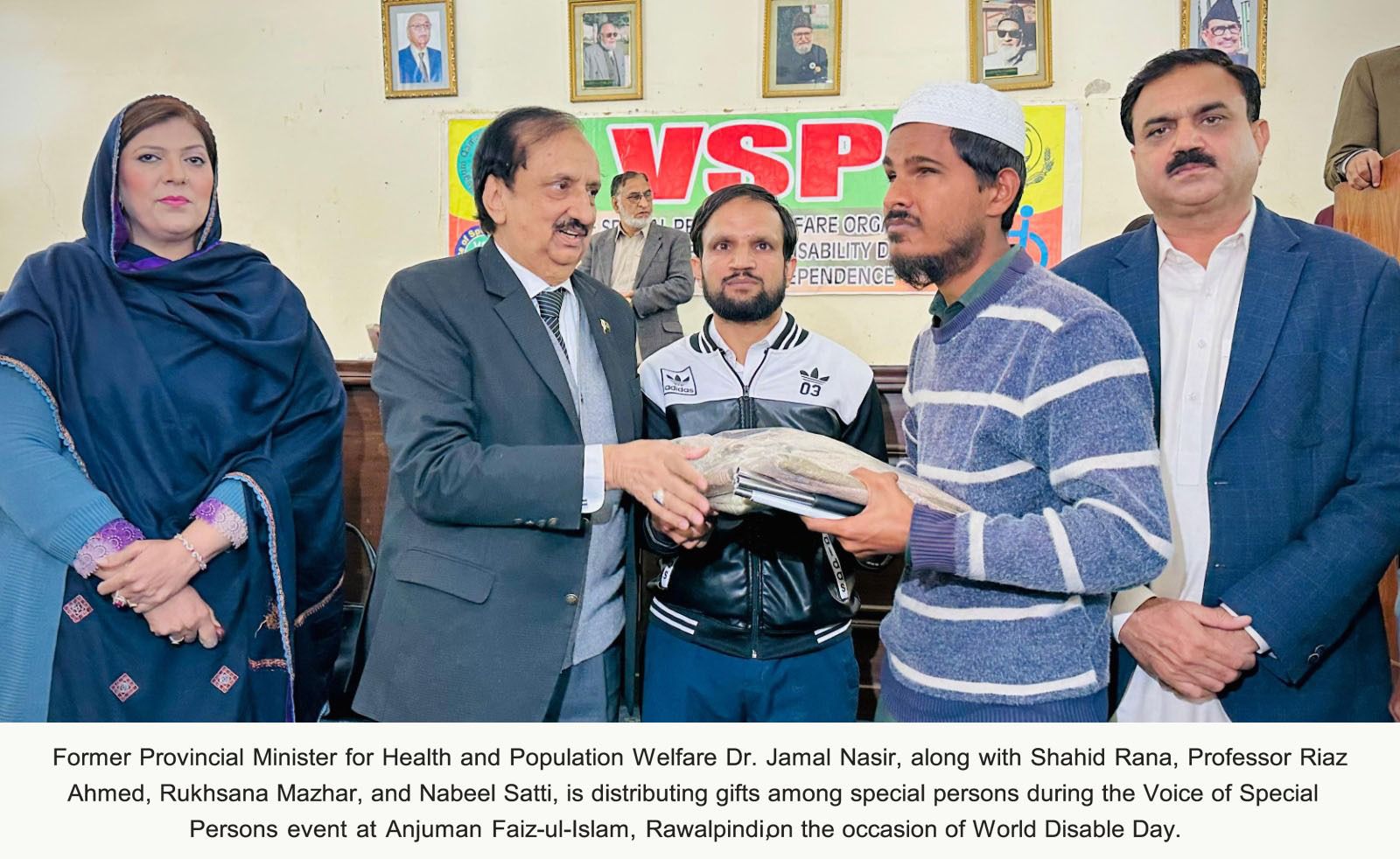 Rawalpindi, December 3( )On the occasion of International Day of Persons with Disabilities, a graceful ceremony was held at Anjuman Faiz-ul-Islam Rawalpindi under the auspices of Voice of Special Persons. The event was attended by representatives of various institutions, persons with disabilities, social workers, and intellectuals. The chief guest was Dr. Jamal Nasir, former Provincial Minister for Health & Population Welfare. Other distinguished guests included Director Social Welfare Rana Shahid, Deputy Director Ms. Rukhsana, President Anjuman Faiz-ul-Islam Dr. Riaz Ahmed, and Chairman Voice of Special Persons Nabeel Satti. Addressing the ceremony, Dr. Jamal Nasir said that only those nations advance that support their disabled and vulnerable segments. He emphasized that serving humanity requires compassion, not wealth. He urged philanthropists to step forward, adding that it is the collective responsibility of the entire society to ensure facilities, employment, and rehabilitation centers for persons with disabilities, as these are essential needs of the time. He called upon the government to immediately and fully enforce the 3% job quota reserved for persons with disabilities in public sector employment. He further demanded the prompt reinstatement of the 1,600+ visually impaired individuals who were previously dismissed from their jobs,