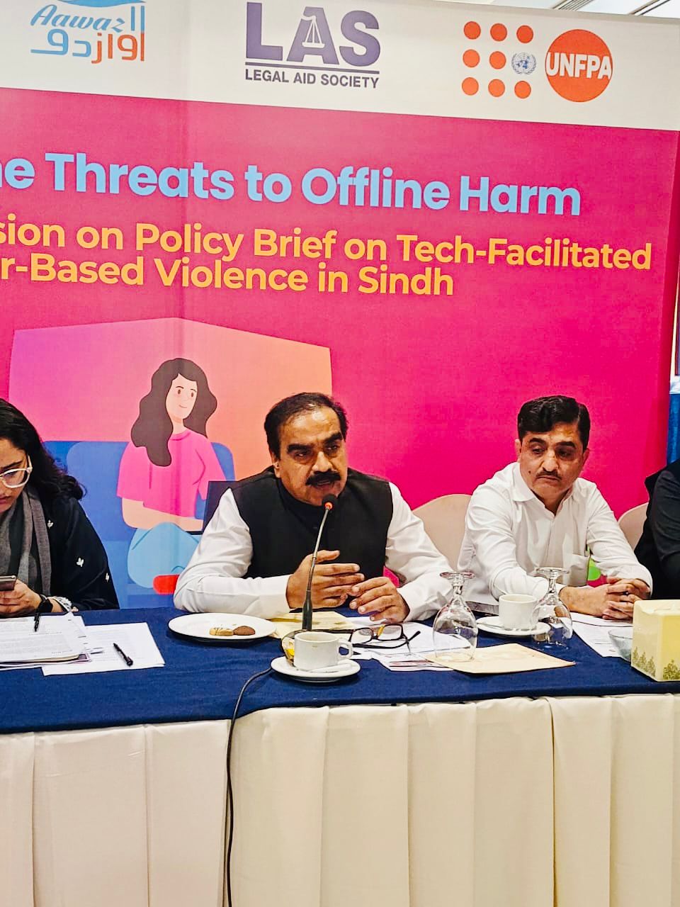 Karachi-. 12 December. Human Rights Department, Government of Sindh has participated in a roundtable discussion organized by the Legal Aid Society (LAS) in collaboration with UNFPA and FCDO under the AWAAZ II Programme at a local hotel. The event focused on the growing challenge of Technology-Facilitated Gender-Based Violence (TFGBV) in Sindh. Director Human Rights Department Agha Fakhur Hussain highlighted that online harassment, cyberstalking, blackmail, and non-consensual sharing of content are rapidly increasing and require urgent institutional attention. He emphasized that TFGBV was not only a cybercrime issue but a significant human rights concern, calling for coordinated action between government departments, law enforcement, civil society, and digital platforms.