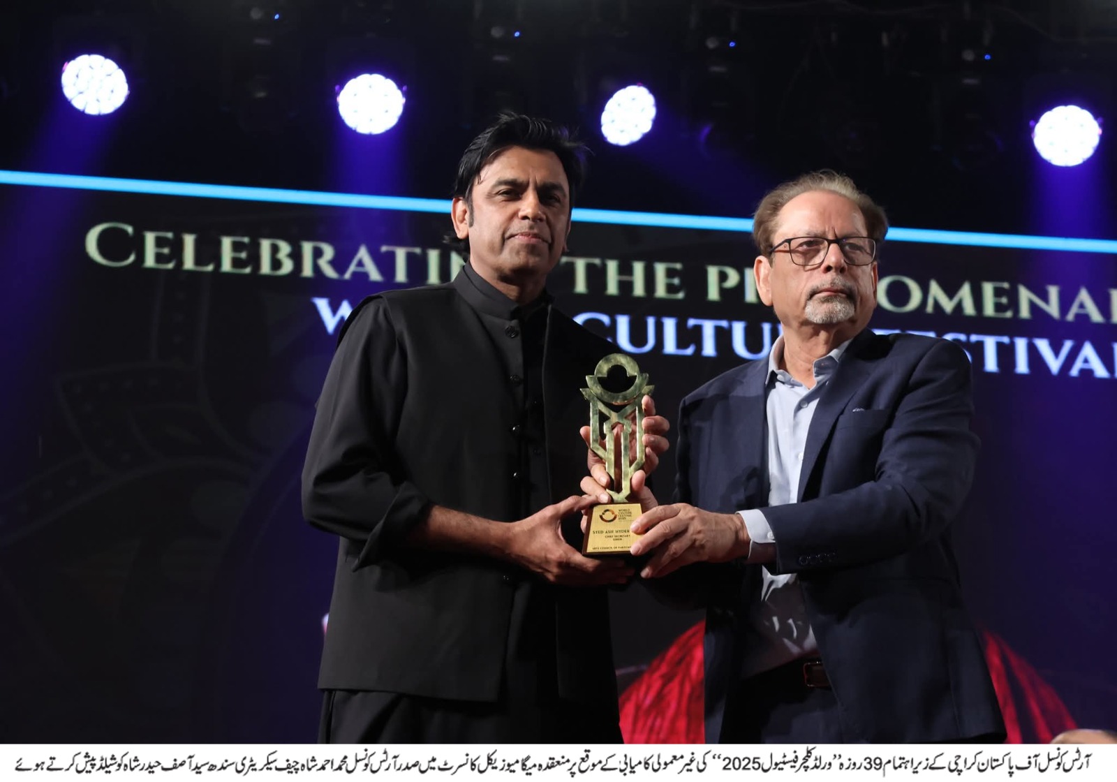 Huma Mir, Syed Sajid Hasan, S.M. Qaiser Sajjad, Muhammad Iqbal Latif, and Muhammad Ayub Sheikh. Co-opted members Chand Gul Shah, Alia Iqbal Naqvi, and Dr. Jaffar Ahmed were also in attendance. Speaking at the Concert, President Arts Council Muhammad Ahmed Shah said that the day was like Eid for Arts Council members and their families. “We invited Rahat Fateh Ali Khan especially for our members. I had invited him for a members’ concert fifteen years ago as well. The Sindh Government has fully supported us, and without its cooperation, we cannot move forward even an inch. During the World Culture Festival, the Chief Secretary Sindh personally supervised all security arrangements,” he added. Chief Secretary Sindh Syed Asif Hyder Shah, in his remarks, thanked Muhammad Ahmed Shah and said that last year artists from 44 countries participated in the World Culture Festival, while this year performers from 142 countries took part. “I believe that next year artists from 190 countries will participate. This concert is a gift from Muhammad Ahmed Shah and the Sindh Government,” he said. At the end of the event, President Arts Council Muhammad Ahmed Shah presented a shield to Chief Secretary Sindh Syed Asif Hyder Shah in recognition of the successful organization of the World Culture Festival, along with traditional Sindhi gifts of ajrak and a Sindhi cap