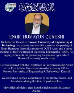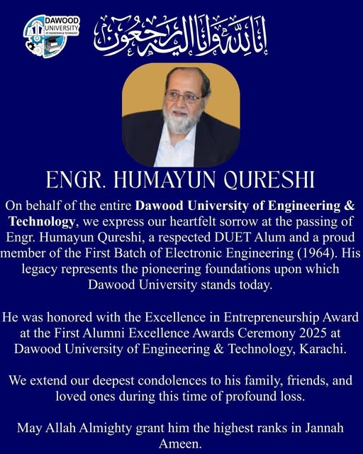 Dawood University of Engineering & Technology expresses its profound grief and heartfelt sorrow over the passing of Engr. Humayun Qureshi, a respected DUET alumnus and a proud member of the First Batch of Electronic Engineering (1964).